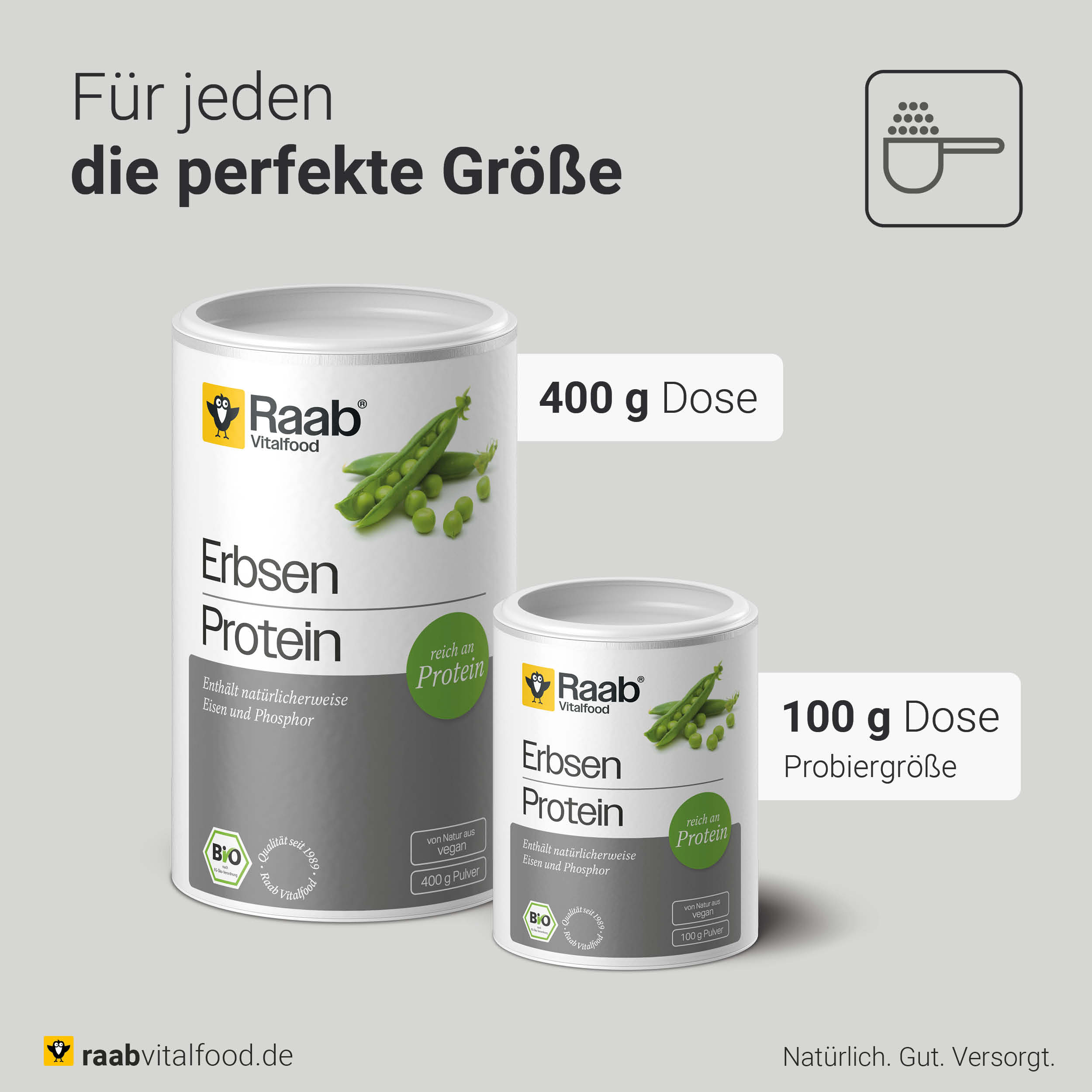 Die Einnahme von Raab Bio Erbsenprotein Pulver macht es einfach, die tägliche Proteinzufuhr in der Ernährung zu ergänzen. Zwei Esslöffel (à 10 g) Erbsenprotein liefern wertvolles pflanzliches Eiweiß und lassen sich vielseitig in die Küche integrieren. Dank des milden, leicht erbsenartigen Geschmacks passt das Erbsenprotein sowohl in Shakes und Smoothies als auch als Zugabe zu Backwaren wie Brot, Kuchen oder Pancakes. So kannst Du den Proteingehalt Deiner Mahlzeiten flexibel und nach Deinem Geschmack ergänzen, ohne den Eigengeschmack Deiner Speisen zu überdecken. Das Erbsenprotein ist ein Topseller bei uns und erfreut sich Jahren steigender Beliebtheit.