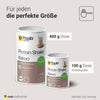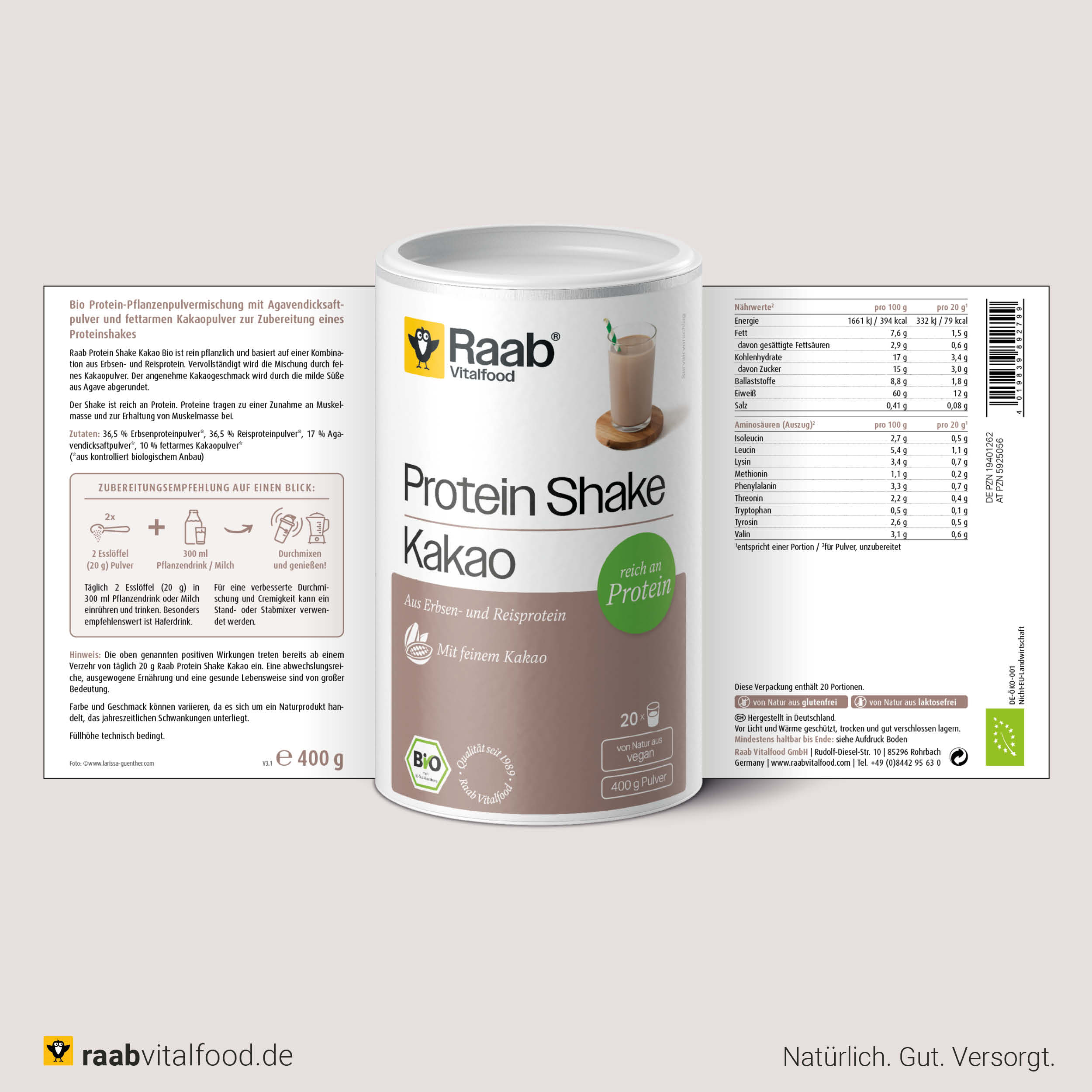 Zutaten: 36,5 % Erbsenproteinpulver*, 36,5 % Reisproteinpulver*, 17 % Agavendicksaftpulver*, 10 % fettarmes Kakaopulver* (*aus kontrolliert biologischem Anbau)