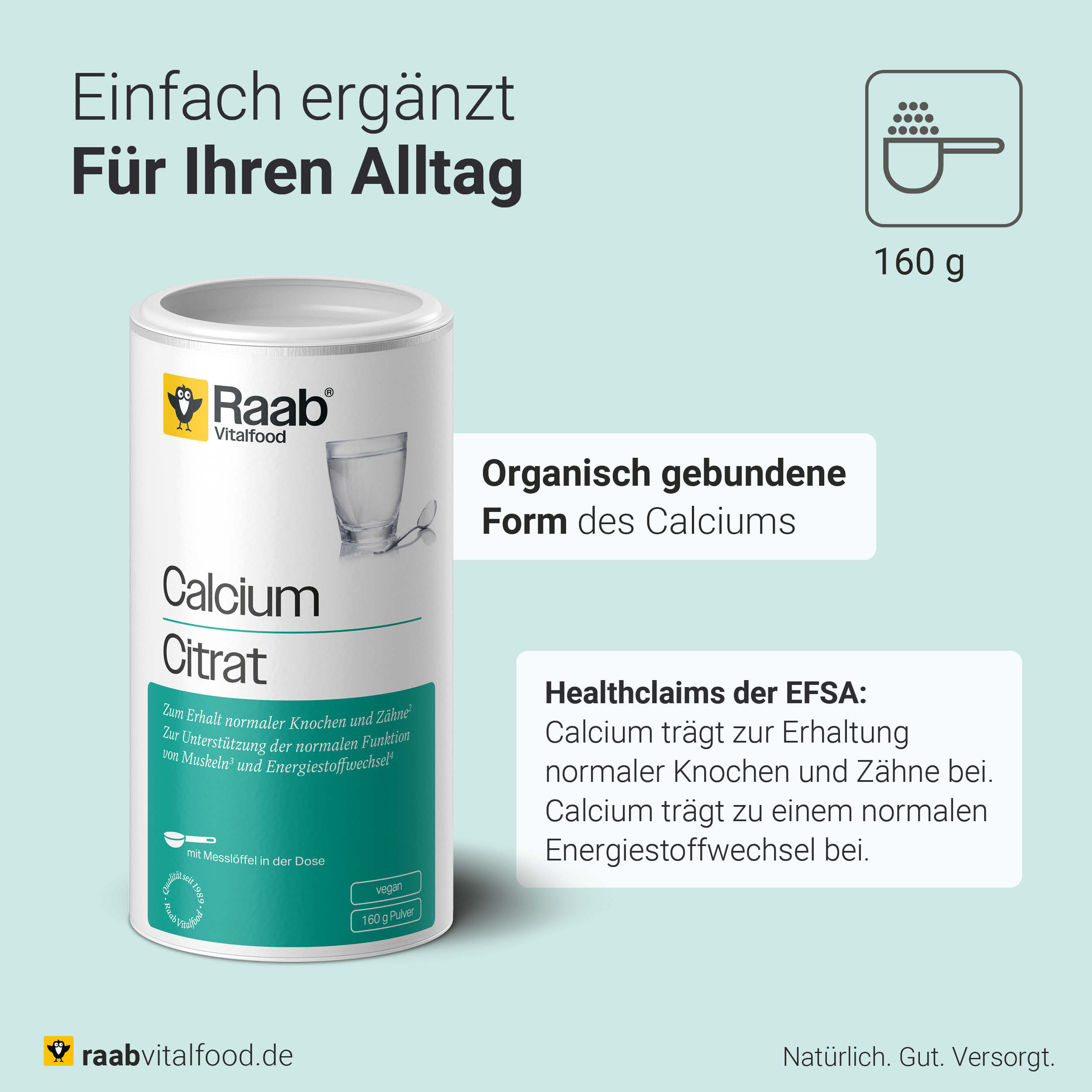 Mit Calciumcitrat bietet Raab Vitalfood eine hochwertige und bewusste Möglichkeit, den Calciumbedarf zur täglichen Ernährung zu ergänzen.