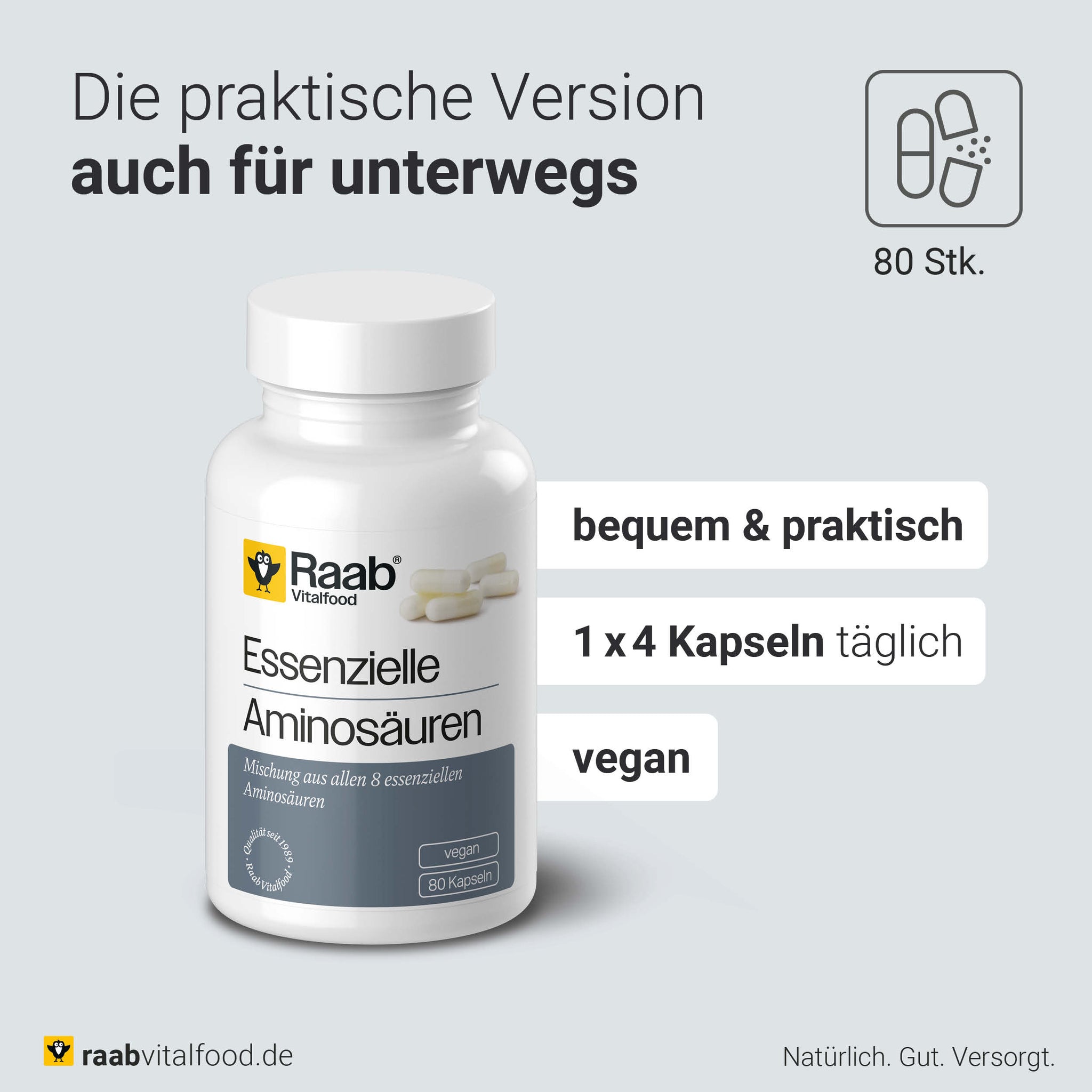 Zutaten: pflanzliche Kapselhülle: Hydroxypropylme- thylcellulose, L-Leucin, L-Valin, L-Isoleucin, L-Lysin, L-Phenylalanin, L-Threonin, L-Methionin, L-Tryptophan